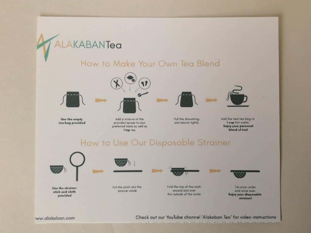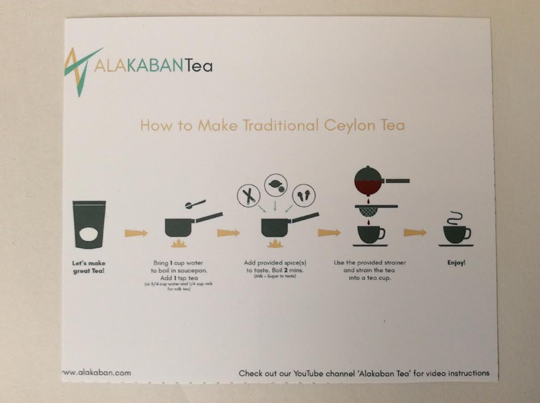 Each Alakaban Tea Box comes with an information card detailing each item in your box for that month: the tea, the spices, the flavour bomb/surprise box and other surprises each month.