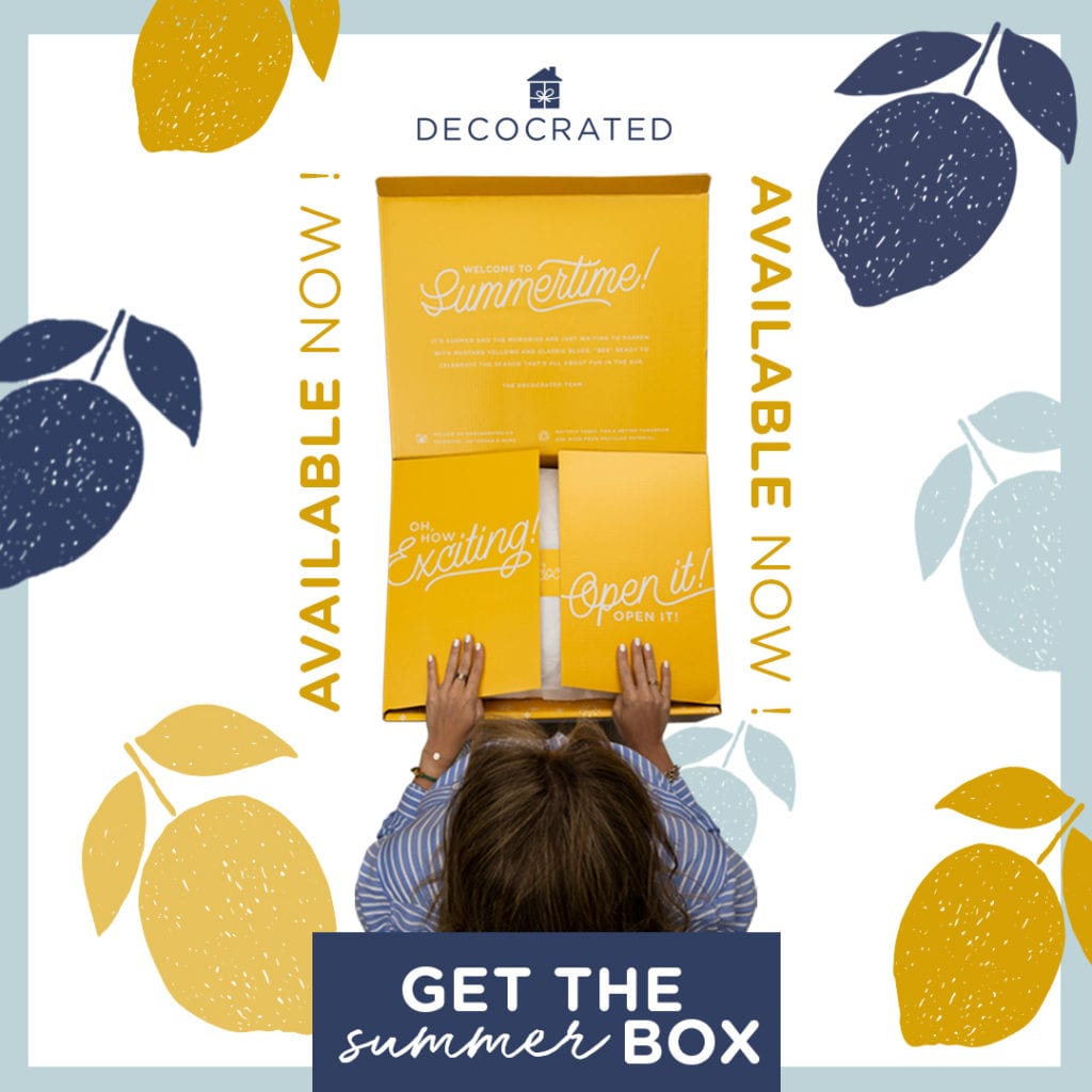 Save $15 off your quarterly or annual Decocrated Summer Box subscription with code SUBBOXCA15 – CLICK HERE!