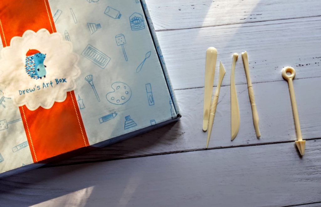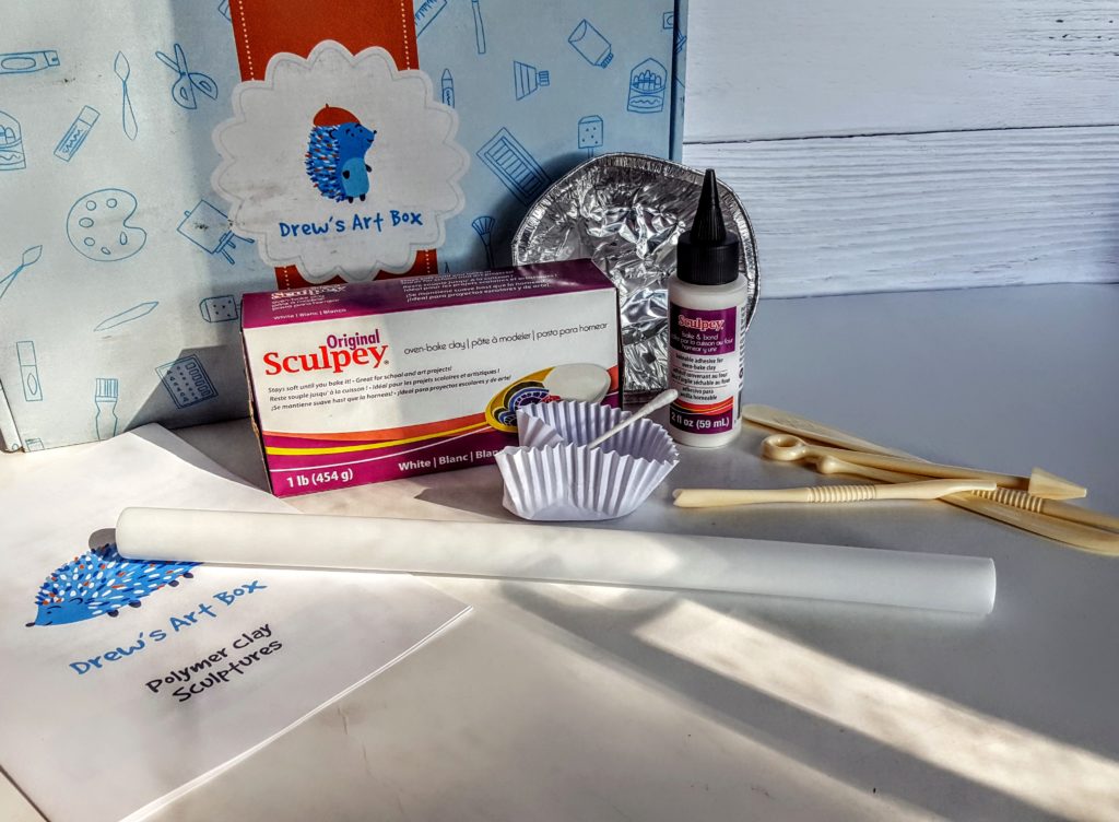 Everything that we received in our “Polymer Clay” edition from Drew’s Art Box. We even have some tools of our own from back in our sculpey phase