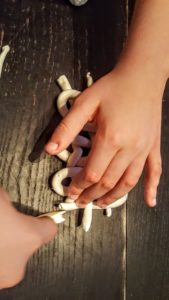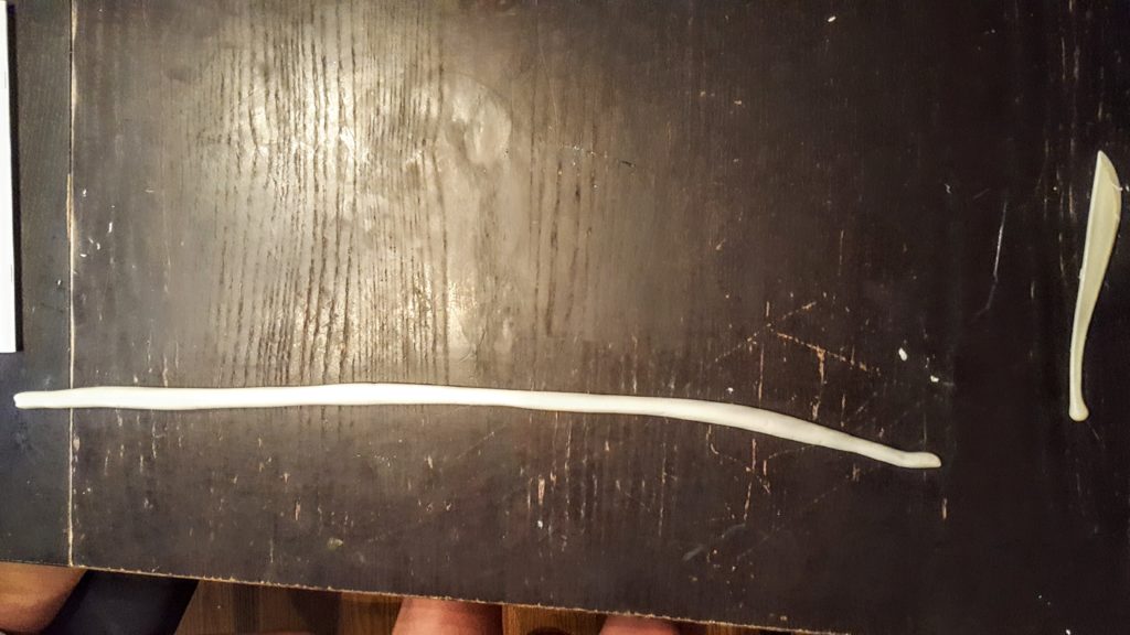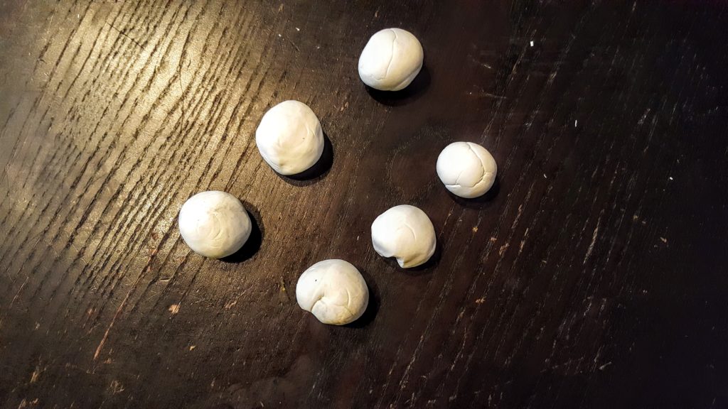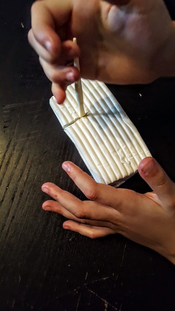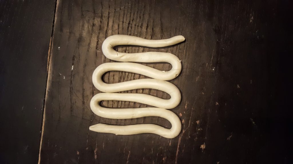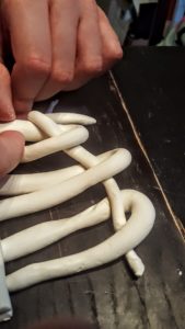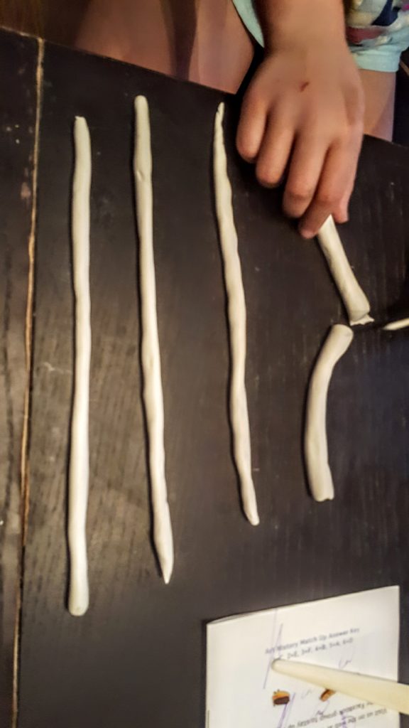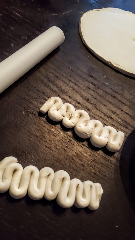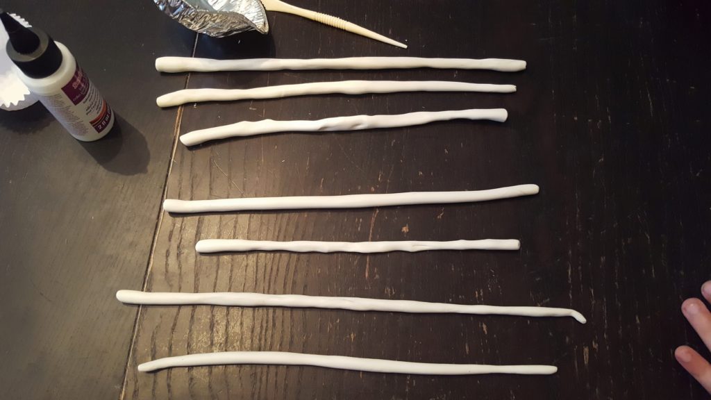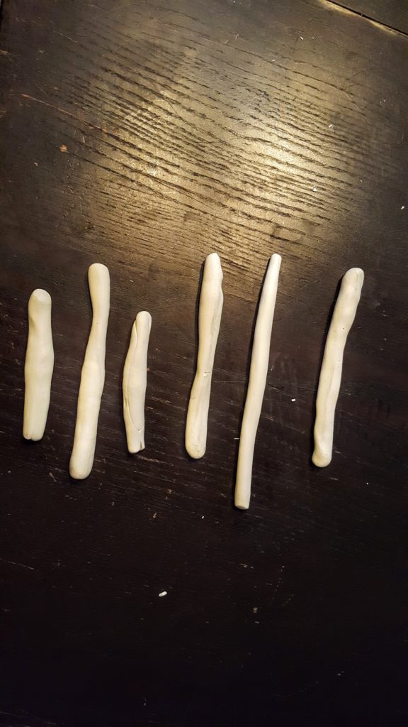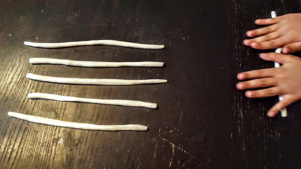 Then we take the other half of the clay and roll it out into four strips. We then cut those in half