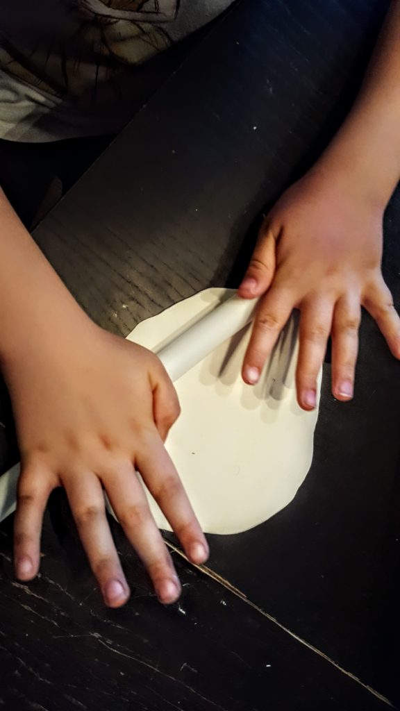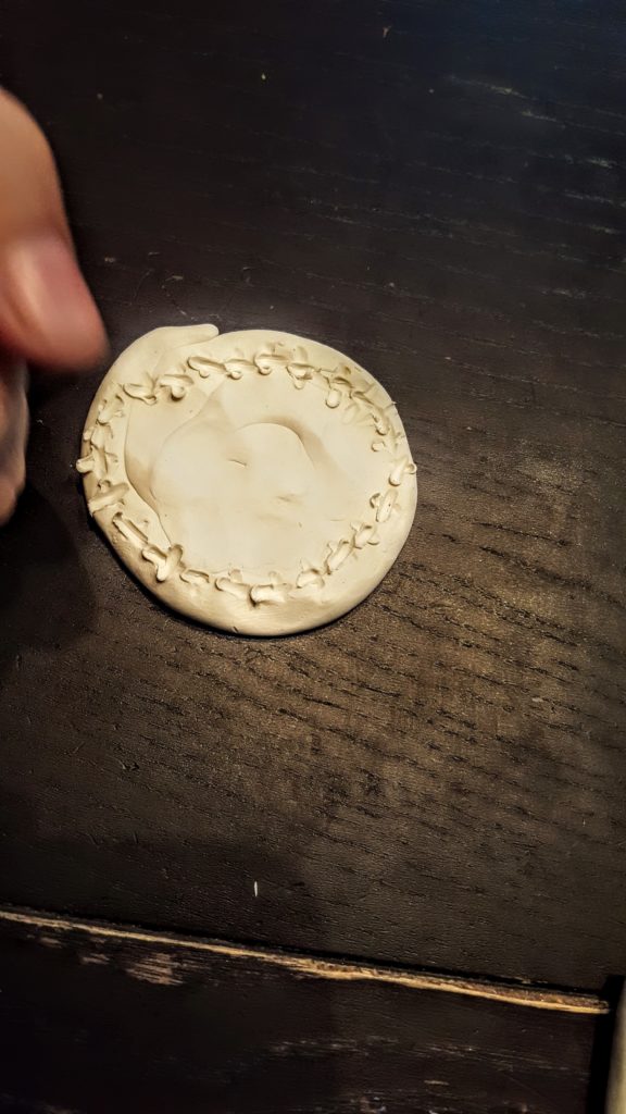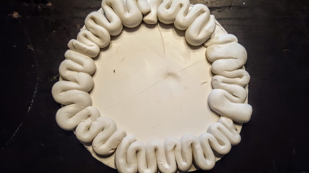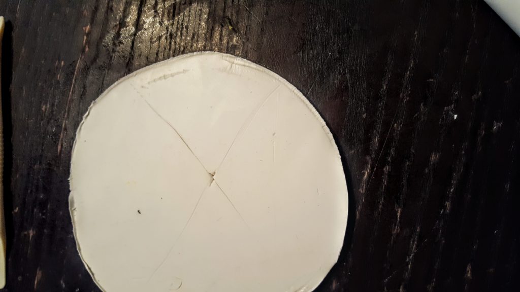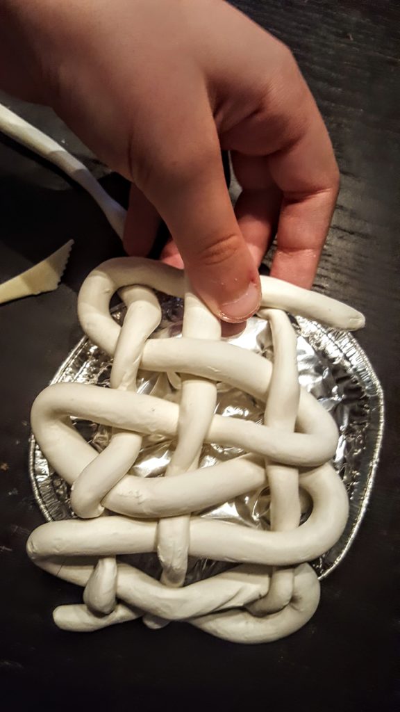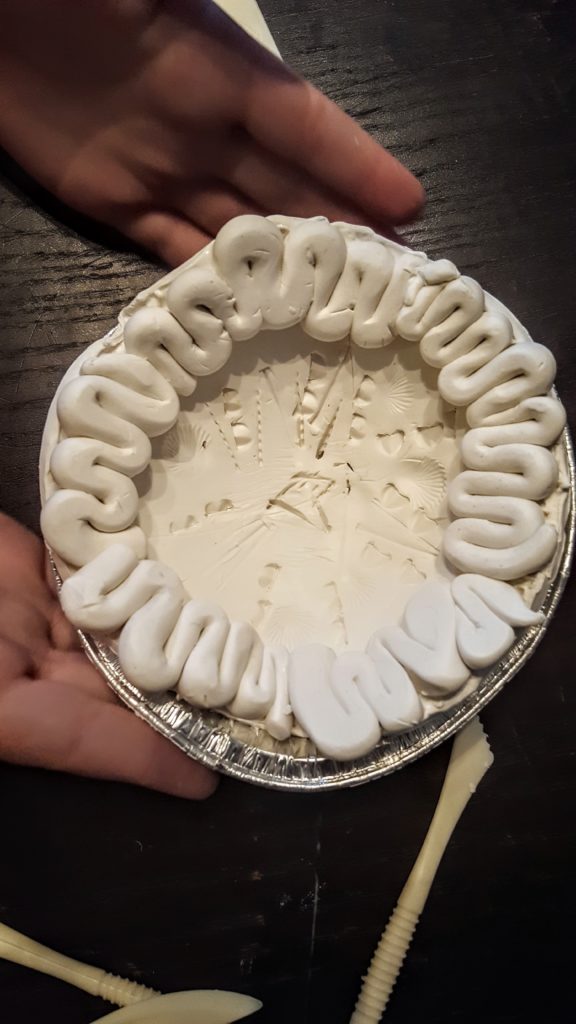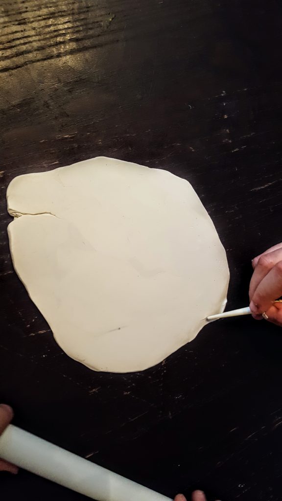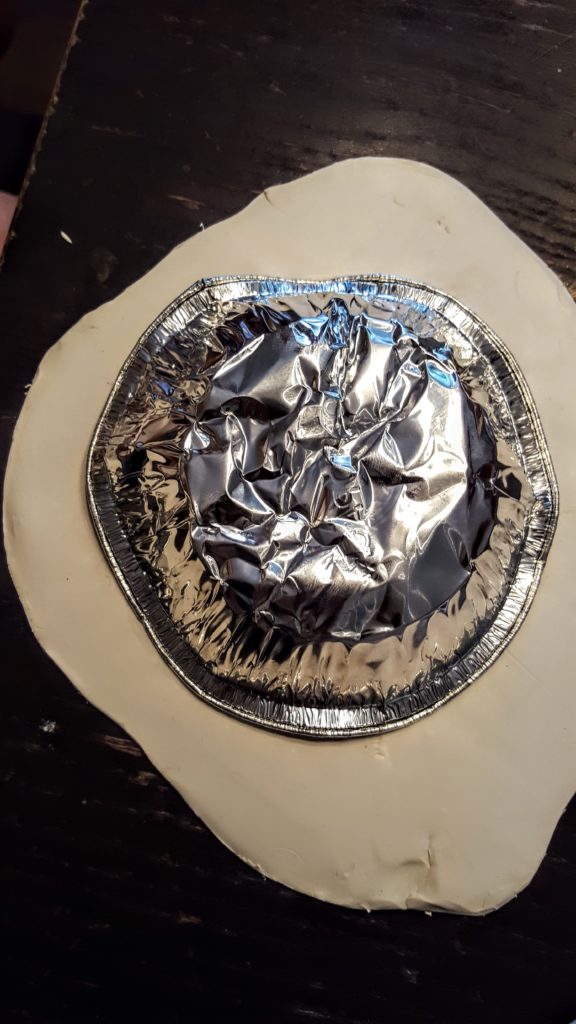 After we’ve rolled out our clay we then use the tin foil pan to carve out a circle