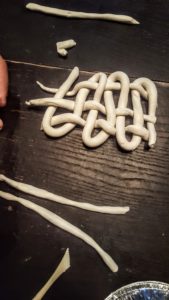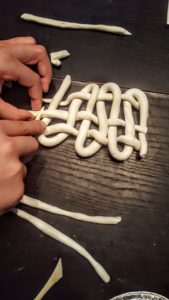 The fifth video teaches the “loom” technique. This practice asked us to create a square and weave together the pieces. Penny had trouble doing this… so we didn’t bother with photos and really tried to just help her get the hang for the finished product.