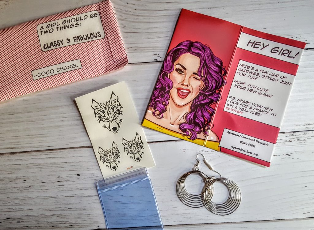 Everything that came in our Earfleek package. They switched out the monthly hair tie for some temporary tattoos!