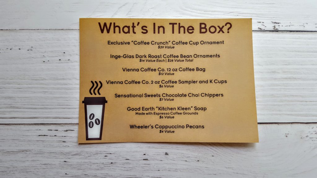 We look for three things in a subscription box; quality, curation and presentation. The Glitter Crunch Box is a wonderful mix of items and perfect for Christmas enthusiasts and collectors alike. The presentation is great, everything is package carefully and arrives perfectly. We would expect as much from a Christmas Ornament company. The quality is FANTASTIC. We knew their ornaments were gorgeous and top of the line but were surprised to see so many handmade items from small vendors included as well. Curation is terrific. This mix of items is pleasing to the eye but also really hones in on the coffee theme and sticks to it! Fantastic month from Glitter Crunch Box