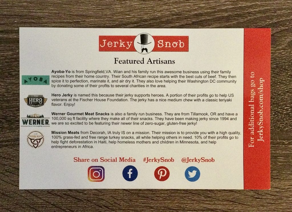 Each Jerky Snob box comes with an information card outlining the featured artisans for that box and describing a little about each business. This box contained the following artisans:
