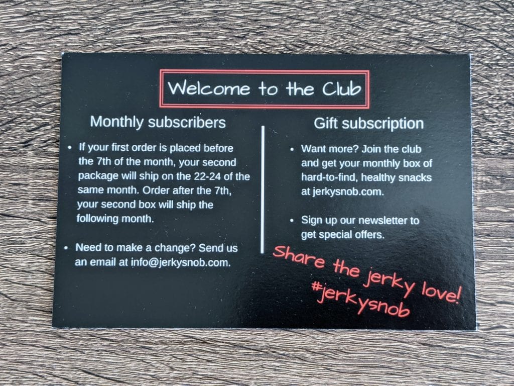 You will find information about when your box will ship, how to contact Jerky Snob and how to score deals and special offers by signing up for the newsletter.