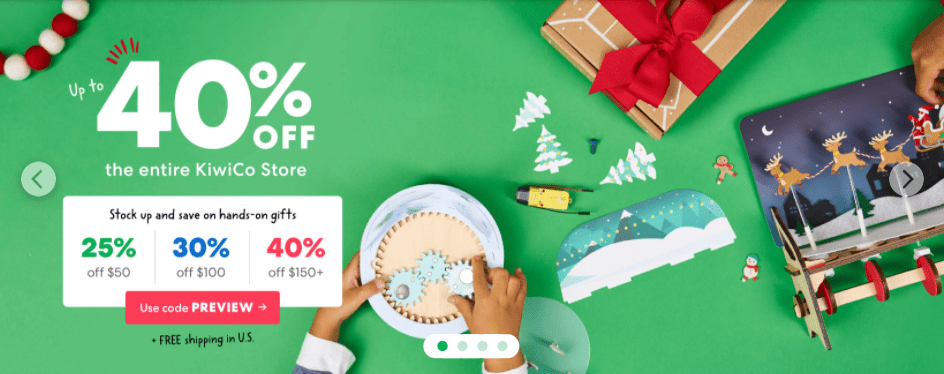 - Stock up and save: Up to 40% off the entire KiwiCo store with code MERRY. 25% off $50+, 30% off $100+, 40% off $150+ (Valid November 26-28, 2021)