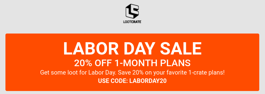 Save 20% off select favorite monthly Loot Crate plans with discount code LABORDAY20