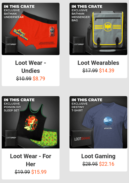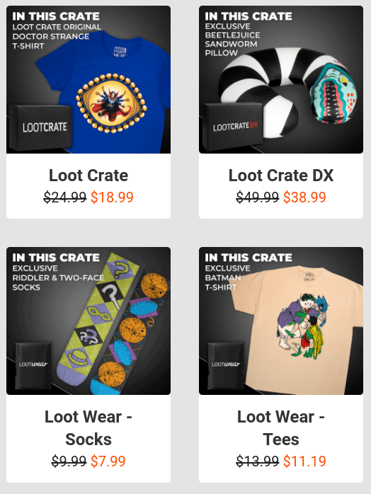 Loot Crate is a worldwide leader in geek subscription boxes for gamers and nerds. With over 20 subscription boxes to choose from, there is a box for you! Check them all out here!