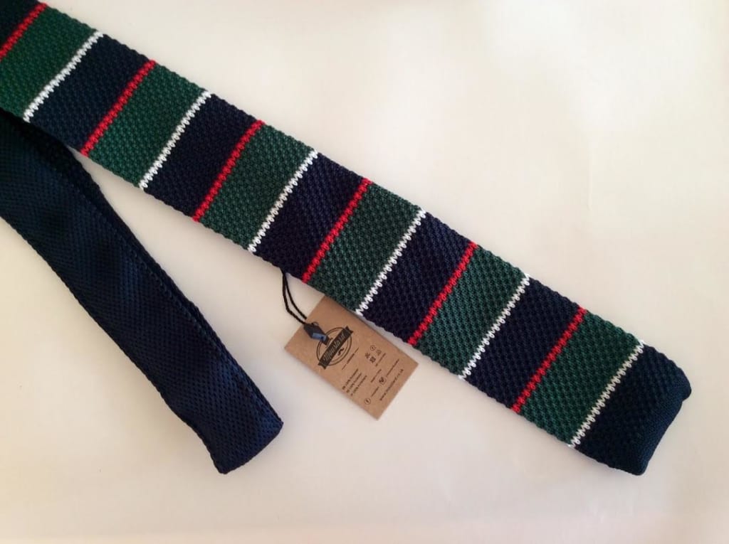 I have not ever seen a knitted tie before, but the knit is tight enough that it doesn’t look like a sweater, rather it gives a unique texture. The bottom of the tie is squared and some traditional dressers may not be a fan.