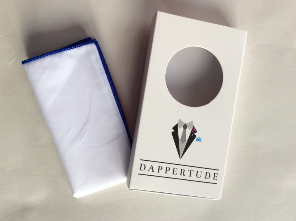 This simple cotton pocket square picks up the navy blue and white of the neck tie to create a complete image. I’m impressed that even though the tie and square are different companies, they work together as though they are one.
