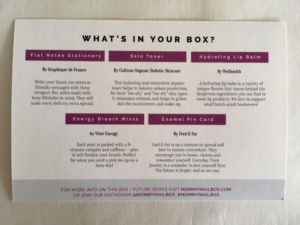Each Mommy Mailbox comes with an information card telling you about each of the products inside your box.