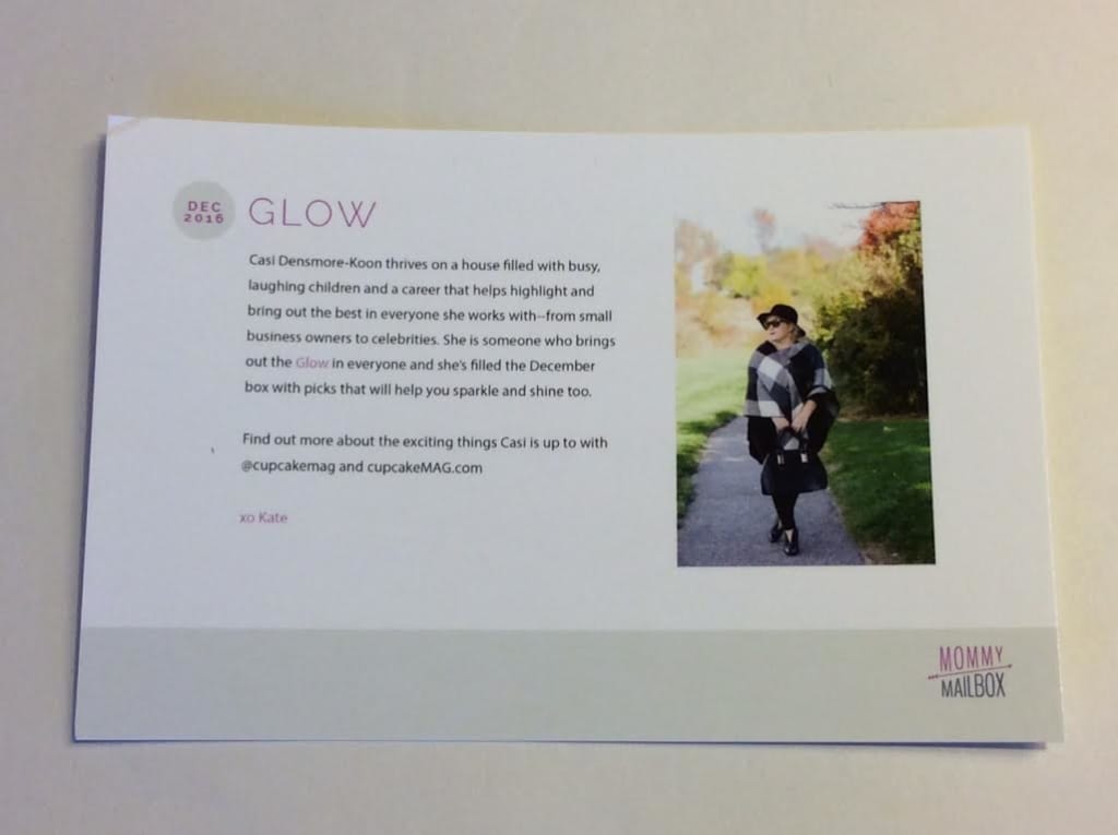 The theme for December’s box is Glow. It has an extra special touch, as everything was handpicked by Casi Densmore-Koon, small business owner to celebrities.