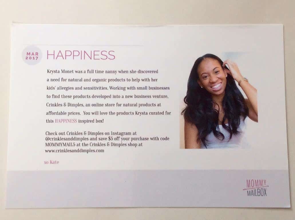The theme for March’s box is Happiness. It has an extra special touch, as everything was handpicked by Krysta Monet, the owner of Crinckles & Dimples, an online store for natural products at affordable prices.
