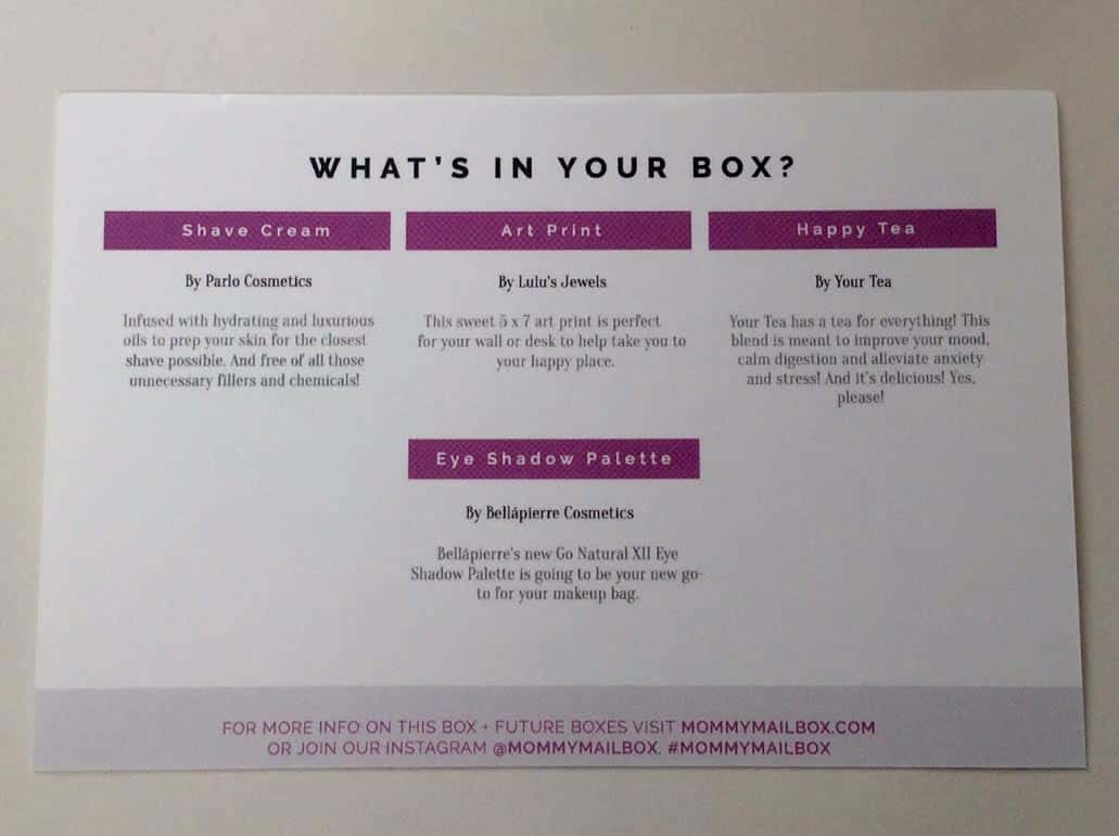 Each Mommy Mailbox comes with an information card telling you about each of the products inside your box.