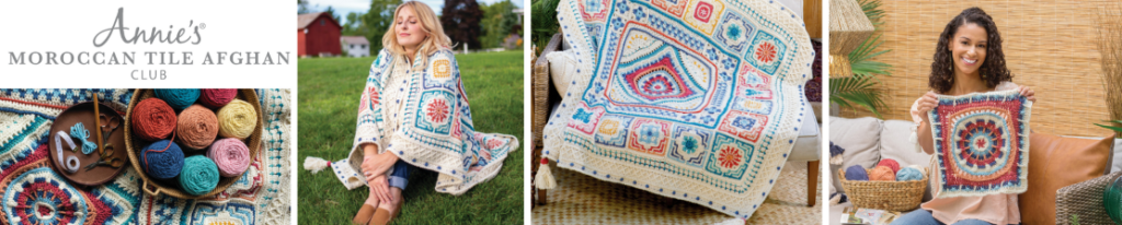 *New* Annie’s Moroccan Tile Afghan Club – a monthly subscription packed with all the yarn you need to crochet a beautiful afghan. Perfectly paced, this 10-month kit series is guided by expert online video tutorials and helpful instructions.