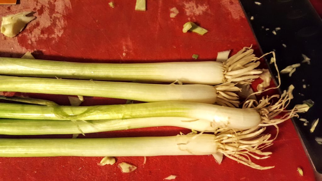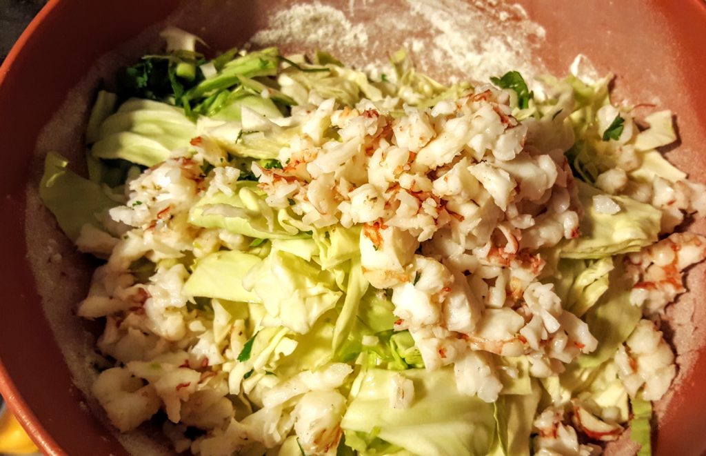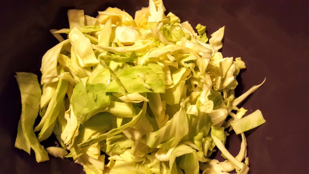 Next we do our prep work. We coarsely chop a half head of cabbage.