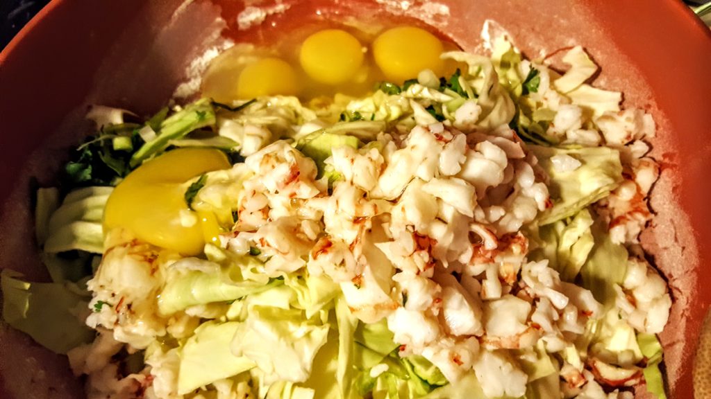 Once your batter has rested add all your ingredients (veggies and meats) to it.
