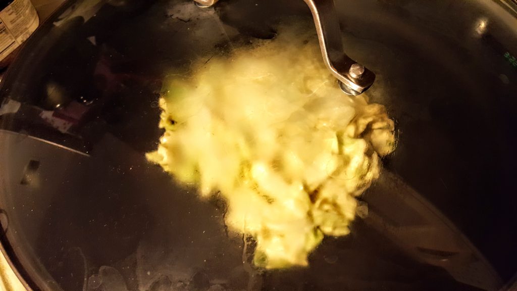Heat 2 tablespoons of oil in a skillet and once hot add your pancakes (which are huge – 2 inches thick and 6 inches in diameter). Once you’ve put it on the pan put a lid on it and wait 5 minutes