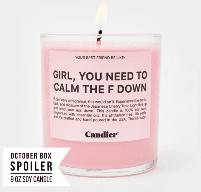- Calm the F Down Soy Candle from Ryan Porter (spoiler) – 9 oz. soy candle + cotton wick, Japanese Cherry Blossom scent, Phthalate free, lead free, paraben free, cruelty free, Crafted and poured by hand in the USA, Plus a portion of all of Ryan Porter’s sales go to support the Friendship Bridge women’s charity