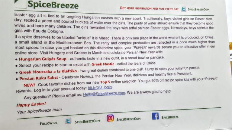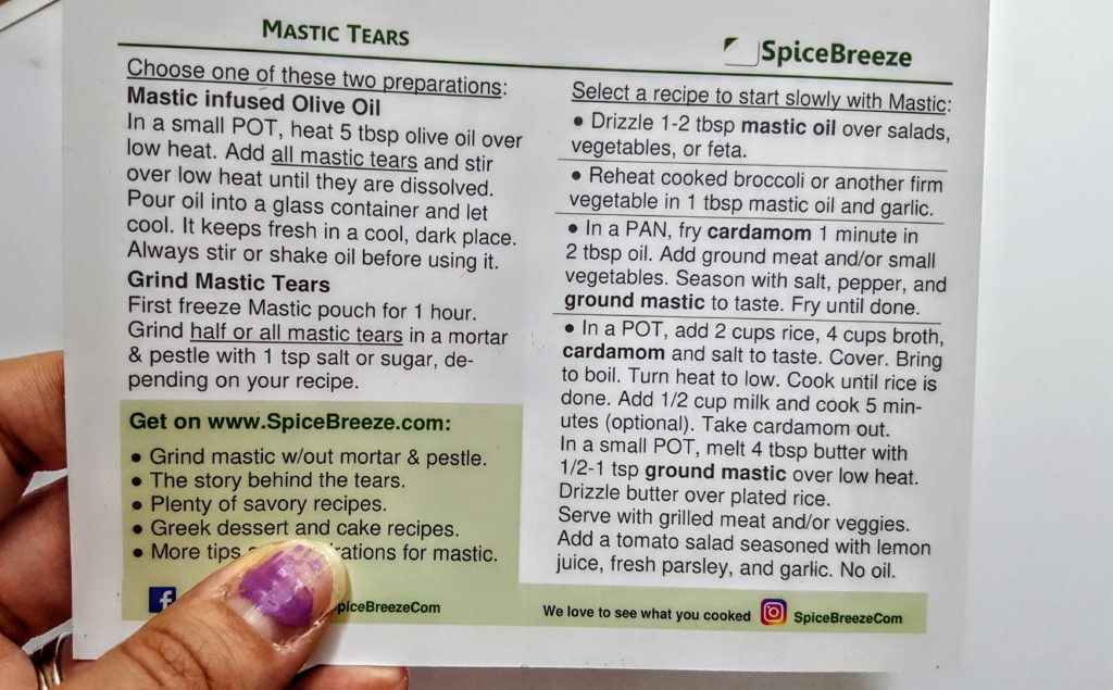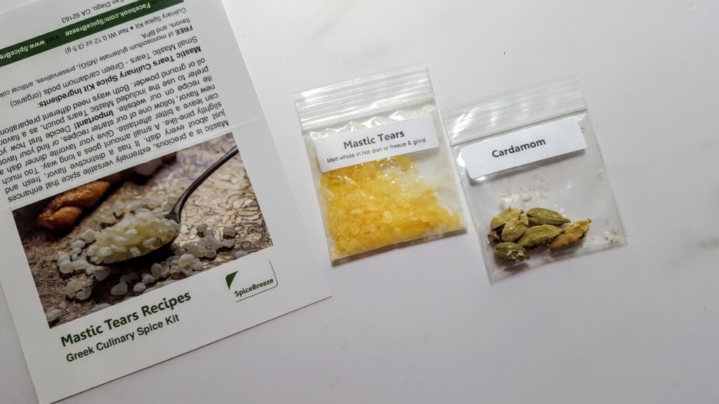 Mastic is a versatile spice that can enhance any dish. With it’s pine like flavor – a little bit goes a long way. This recipe kit came with 4 different recipe options – create a mastic dressing for salads, reheat with a firm vegetable like broccoli, fry with cardamom and ground meat or make a rice dish that uses a mastic cream sauce. We haven’t tried this yet but are kind of excited to use it in a rice dish