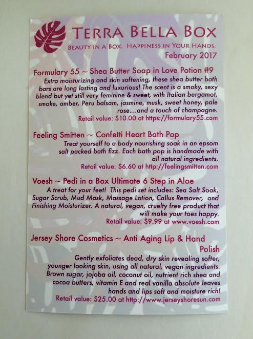 Each Terra Bella Box comes with an information card detailing each item in your box for that month, as well as the retail value and a website link is provided for additional purchases or information about each product.