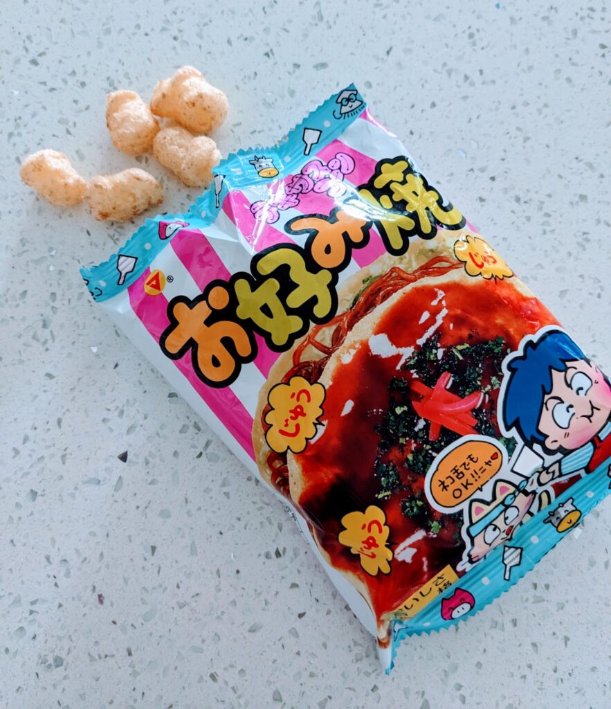This soft corn snack is inspired by the Japanese dish, Okonomiyaki. Okonomiyaki is a popular Japanese dish similar to a pancake, made with a mixture of ingredients like cabbage, egg, meat, cheese, onion, and seafood. Have you tried Okonomiyaki before?