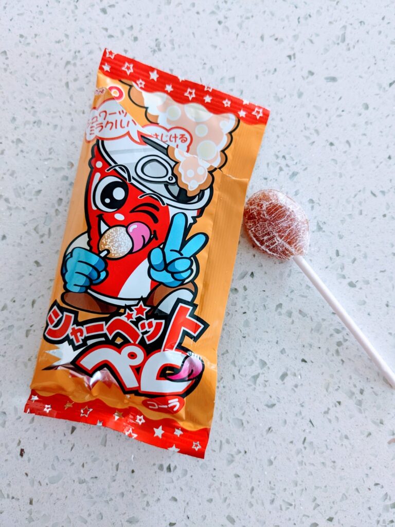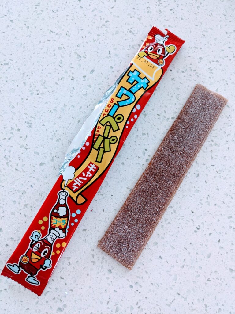 Open the candy bag (carefully!), take a lick of the cola-flavored lollipop, then dip it into the candy powder for a bubbly burst of flavor.