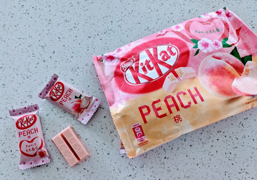 The best KitKat we have ever tasted! If you love peaches or anything peach-flavored, you need to try these mini Peach KitKat bars. They are delicious!!! They are covered in a peach-flavored white chocolate (I think?) that gives them a light peach taste. It’s not overpowering, but just the right amount. They are the perfect snack size to share or take on the go.