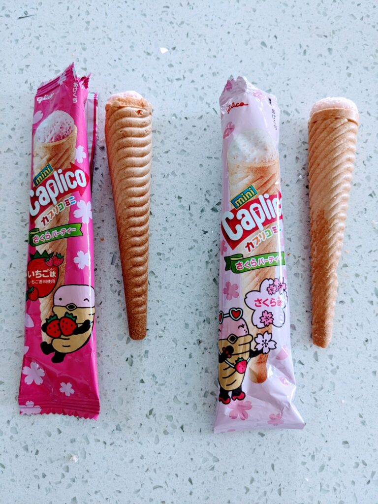 We were lucky to get two mini cones, one strawberry and one cherry blossom. So cute and fun to eat. The strawberry tasted like the strawberry ginza rusk from February 2023’s Tokyo Treat box. My girls loved that the filling went all the way to the bottom of the wafer. They are the perfect size for snacking.