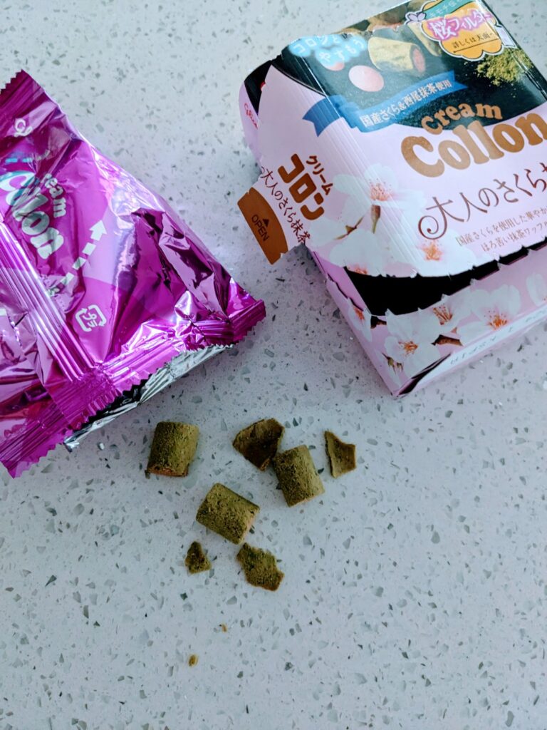 These tiny cookie bites have an outside layer that is made of matcha cookie. It’s flaky and has a taste that is a tad on the bitter side. This contrasts perfectly with the sweet sakura cream filling that together creates a delicious balance in both flavor and texture.