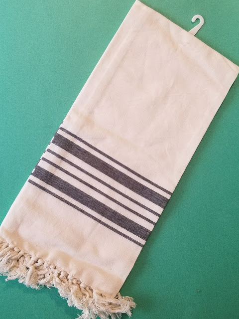 We got an adorable tea towel, I get quite a few towels like these in boxes and I use them as face towels because they are very soft and I need to have a few towels and washcloths that are just for me to use on my face. This towel is very well made and goes with many different decor styles being plain white with just a few blue stripes.