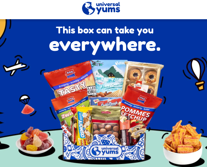 Universal Yums is a snack subscription box delivering international snacks and candies from a new country each month. Choose your box size and head off on a flavor adventure around the world!